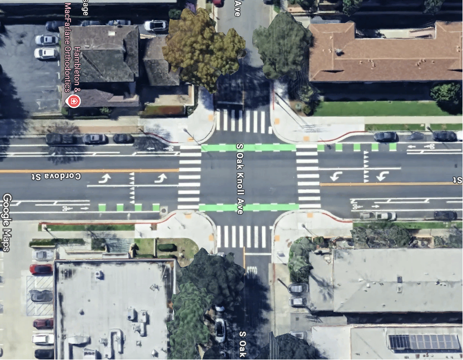 La intersección de S Oak Knoll Ave y Cordova St tiene una falla estructural de visibilidad. Los conductores en la línea de parada no pueden ver el tráfico de Cordova hasta que ya han invadido el paso peatonal.
